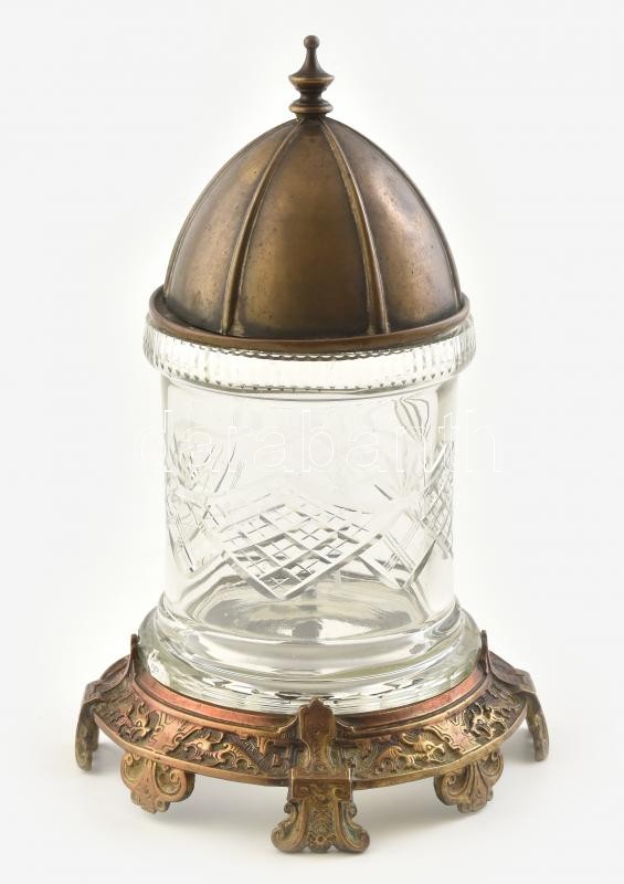 Leírás: Kristály bonbontartó, díszes fém aljjal és érdekes formájú fedővel, kopott, m: 28 cm