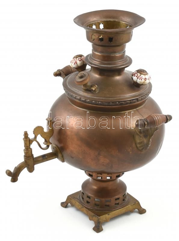 Orosz cári szamovár XIX. sz. Réz, porcelán gombokkal. Kopott, hiányos,... https://www.darabanth.com/hu/421-Gyorsarveres/421.0/Mutargy-papirregiseg-egyeb/Mutargyak-antikvitas~500008/Orosz-cari-szamovar-XIX-sz-Rez-porcelan-gombokkal-Kopott-hianyos-Jelzett-m-35-cm~II2667418