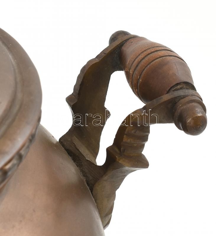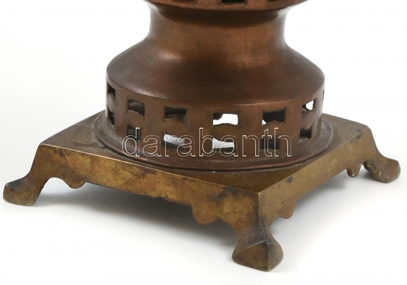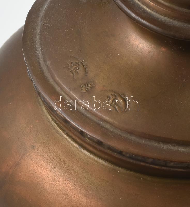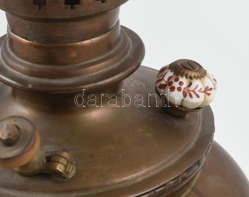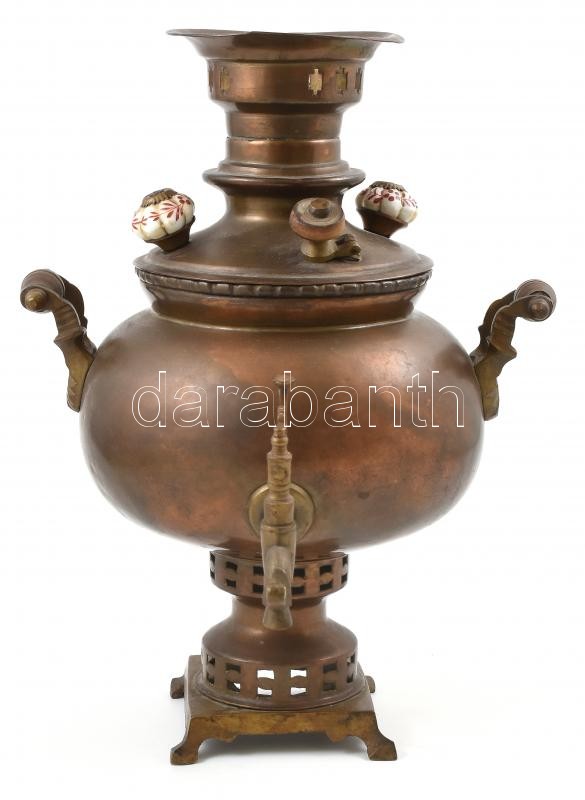 Leírás: Orosz cári szamovár XIX. sz. Réz, porcelán gombokkal. Kopott, hiányos, Jelzett, m: 35 cm