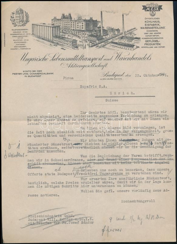 Leírás: 1946 Bp., Ungfarische Lebensmitteltransport und Warenhandels Aktiengesellschaft fejléces levélpapírjára írt levél, rajta a gyár látképével