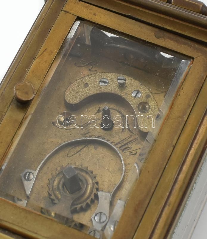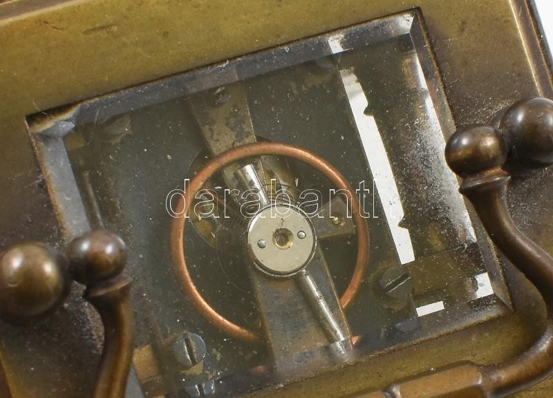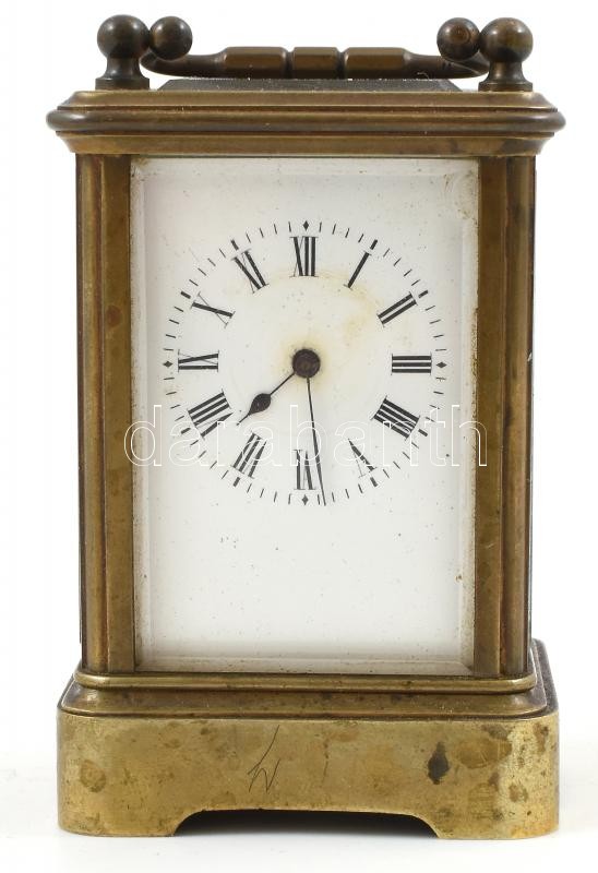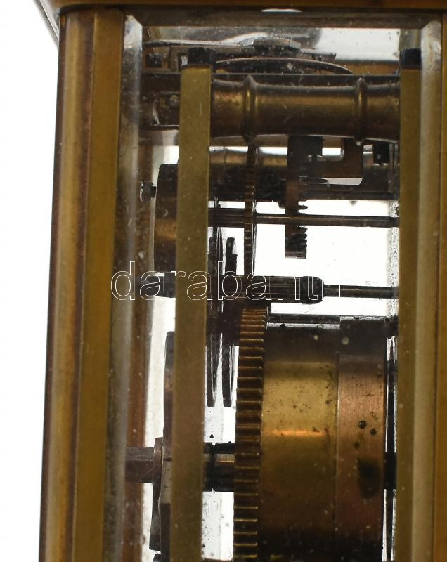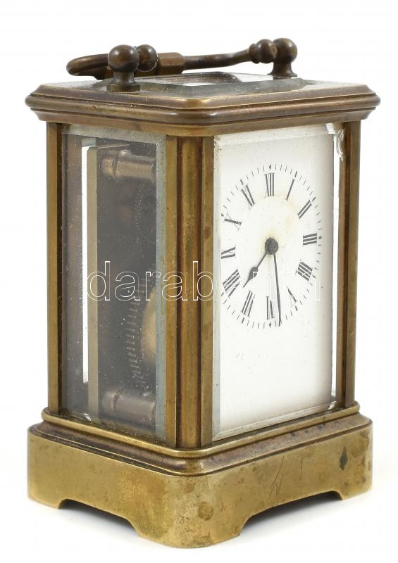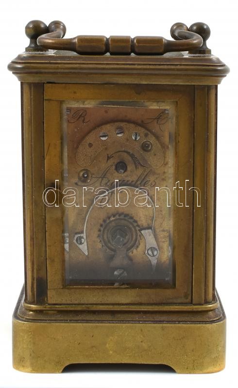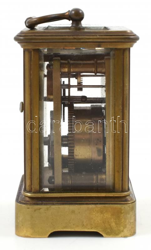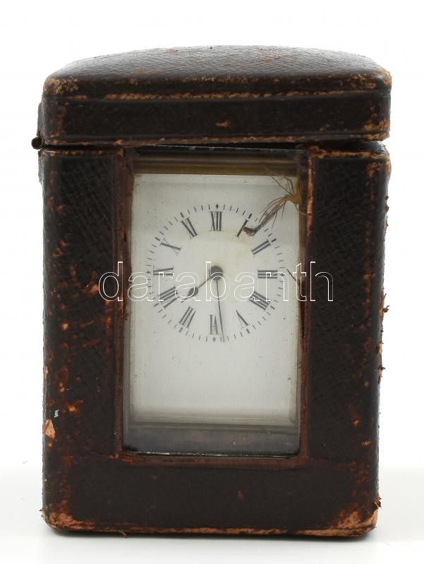 Aiguilles antik francia utazó óra, XIX. sz. Réz, jelzett szerkezettel, fazettált üveggel. Bőr borítású, bársony bélésű, üvegezett tokban. A tokon korának megfelelő kopásnyomokkal, az óra üvegén néhány kis csorba, egyébként szép állapotban. 8,5x6,5x6 cm / Aiguilles antique French brass carriage clock, 19th century, with small chips in the glass, in slightly worn original leather case.
