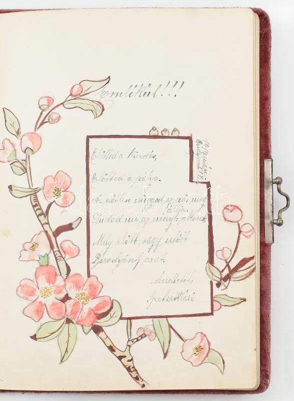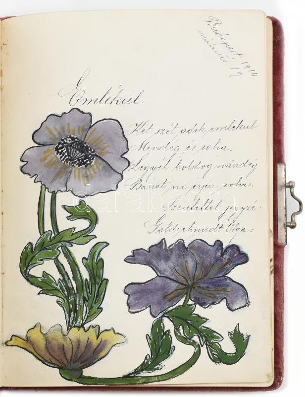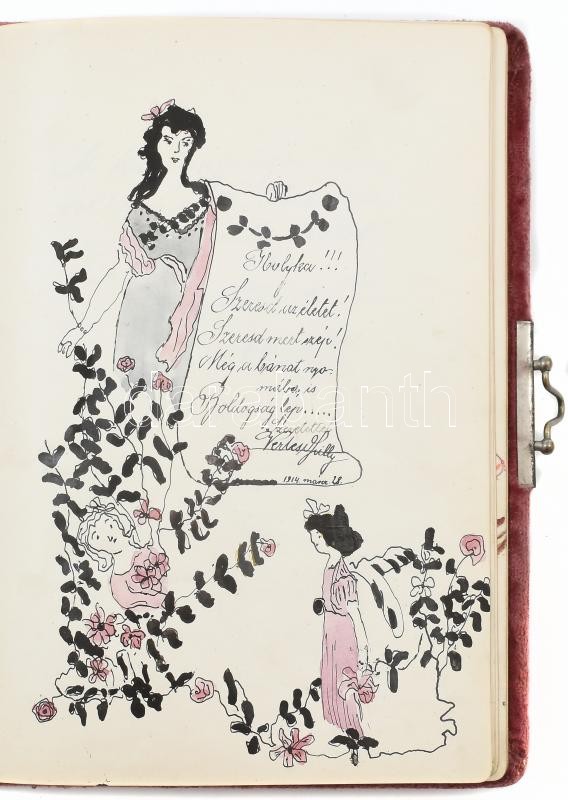 1913-1915 Bp., emlékkönyv, kézzel írt bejegyzésekkel, rajzokkal, bárso... https://www.darabanth.com/hu/421-Gyorsarveres/421.0/Mutargy-papirregiseg-egyeb/Tortenelmi-dokumentumok-keziratok-erdekessegek~500019/1913-1915-Bp-emlekkonyv-kezzel-irt-bejegyzesekkel-rajzokkal-barsony-boritasu-kapcsos-f~II2675538