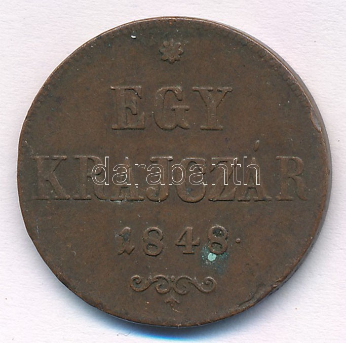 1848. 1kr Cu T:2,2- patina, ph Adamo B1 https://www.darabanth.com/hu/421-Gyorsarveres/421.0/Numizmatika/Magyar-es-magyar-verdejelu-fem-es-ezustpenzek~3000022/1848-1kr-Cu-T2-2-patina-ph-Adamo-B1~II2667211