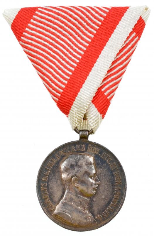 1917. "Károly Ezüst Vitézségi Érem II. osztálya" peremen jelzett Ag kitüntetés modern mellszalagon. Szign.: Kautsch T:2- Hungary 1917. "Silver Gallantry Medal, 2nd Class" Ag decoration with hallmark on the edge, on modern ribbon. Sign.: Kautsch C:VF edge error NMK: 306.