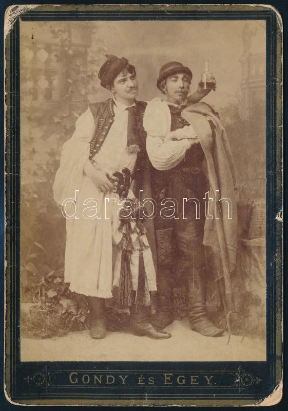 Leírás: cca 1870-1880 Férfiak népviseletben, pálinkával, pisztollyal, keményhátú fotó Gondy és Egey debreceni műterméből, törésnyomokkal, 16,5×11 cm