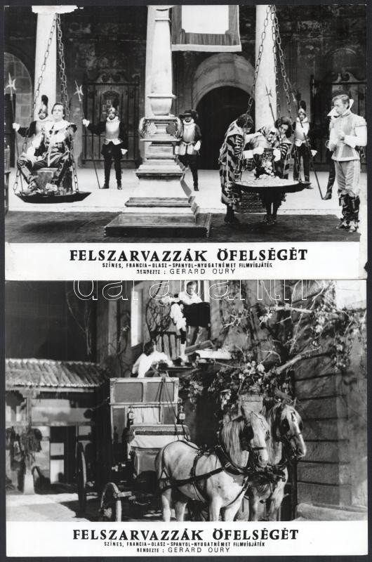 cca 1971 ,,Felszarvazzák őfelségét" című francia film jelenetei és szereplői (köztük Louis de Funes), 10 db vintage produkciós filmfotó, ezüst zselatinos fotópapíron, a használatból eredő (esetleges) kisebb hibákkal, 18x24 cm