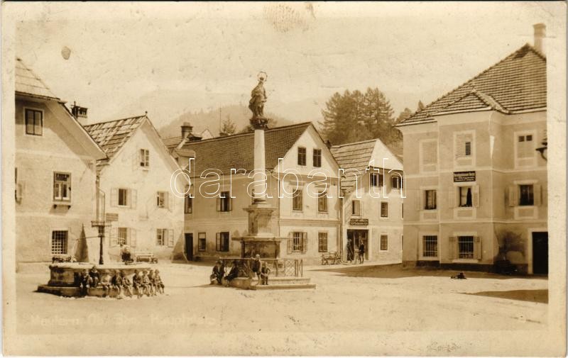 Leírás: 1930 Mautern in Steiermark, Brunnen, Hauptplatz, Mariensäule, Vorschusskassen Verein der Pfarrgemeinde, Sepp. Lackner / main square, well, shop, statue, bank. photo