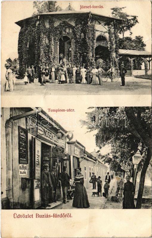 1907 Buziásfürdő, Baile Buzias; József forrás, Templom utca, Nosek Gusztáv üzlete és saját kiadása / mineral water spring, street, shop (gyűrődések / creases)