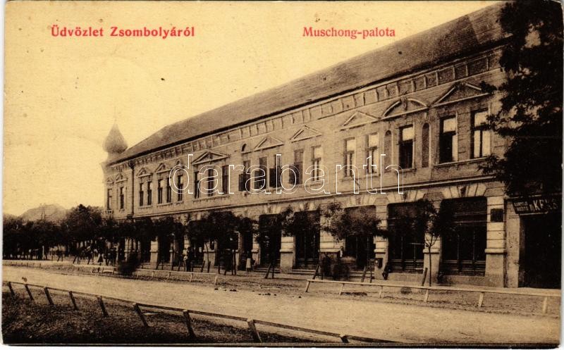 Leírás: 1907 Zsombolya, Jimbolia; Muschong palota, gyógyszertár, Ifj. Keks. kárpitos és tisztító üzlete. W.L. 427. / palace, shops, pharmacy (fl)