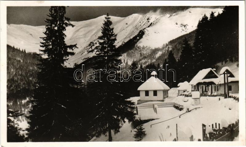 Leírás: 1943 Radnai-havasok, Muntii Rodnei; Borbereki Felső Bánya az Ünőkővel. Foto Kováts László mérnök / winter, rest house