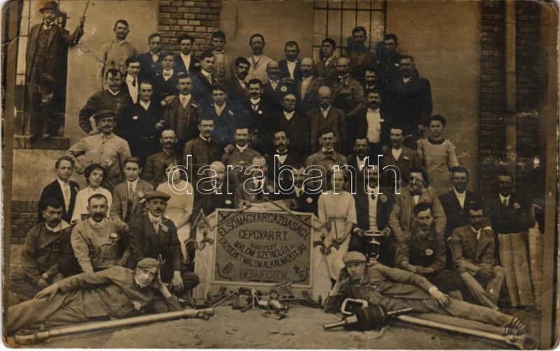 Leírás: 1912 Debrecen, Első Magyar Gazdasági Gépgyár rt. Budapest Malom szerelői és Erzsébet malom alkalmazottjai, csoportkép. Burg Izsó műterme, photo (EB)
