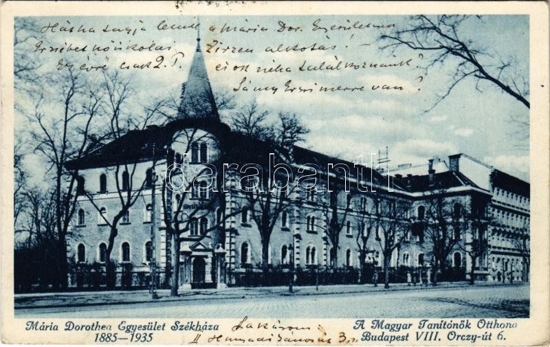 1935 Budapest VIII. Mária Dorothea Egyesület székháza, Magyar Tanítónő... https://www.darabanth.com/hu/422-Gyorsarveres/422.0/Kepeslapok/Magyarorszag~1500004/1935-Budapest-VIII-Maria-Dorothea-Egyesulet-szekhaza-Magyar-Tanitonok-Otthona-Orczy-ut-6~II2677421