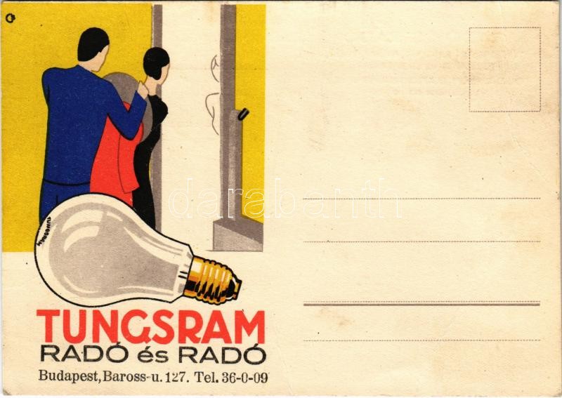 Leírás: 1935 Tungsram villanykörte reklám képeslap. Radó és Radó, Budapest VIII. Baross utca 127. / light bulb advertisment postcard s: Csemiczky Tihamér (fa)