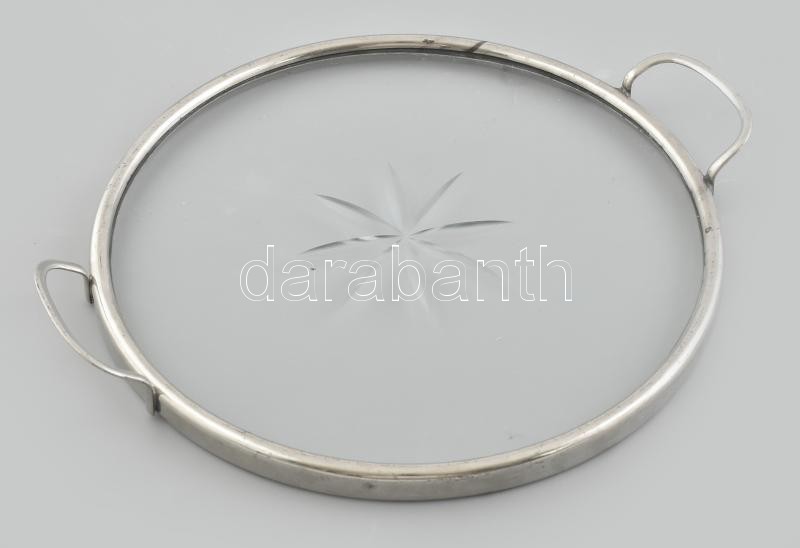 Leírás: Füles tálca. Metszett üveg, nikkelezett fém, kis kopásnyomokkal, 30x25 cm