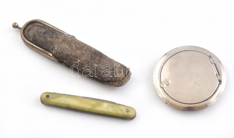 Leírás: Régi, gyöngyház nyelű női bicska, tokban, h: 6 cm + fém gyógyszertartó, d: 4,5 cm