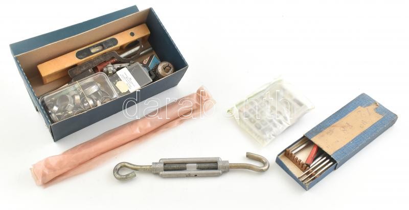 Leírás: Szerszám tétel: gyorsacél maró, vízmérték, fűrészlapok, Norma fém bilincsek, csuklóspántok, stb., cipősdobozban