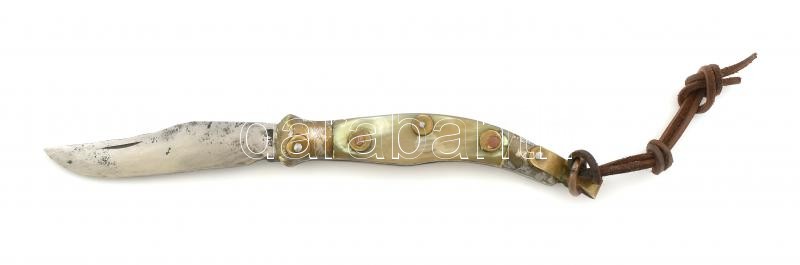 Leírás: Válik jelzett egyedi készítésü zsebkés, bicska. Szaru, réz. 27 cm