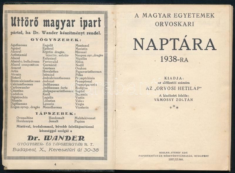 1938 Orvoskari naptár. Kiadja az Orvosi Hetilap. Bp., 1937, Rigler Józ... https://www.darabanth.com/hu/422-Gyorsarveres/422.0/Mutargy-papirregiseg-egyeb/Nyomtatvanyok~1000002/1938-Orvoskari-naptar-Kiadja-az-Orvosi-Hetilap-Bp-1937-Rigler-Jozsef-Ede-Papirnemugyar-95~II2680564