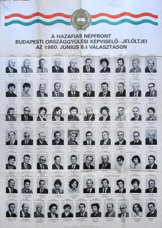 1980 A Hazafias Népfront budapesti országgyűlési képviselőjelöltjei, nagyméretű választási plakát, hajtva, kisebb szakadásokkal, néhány folttal, 118x84 cm