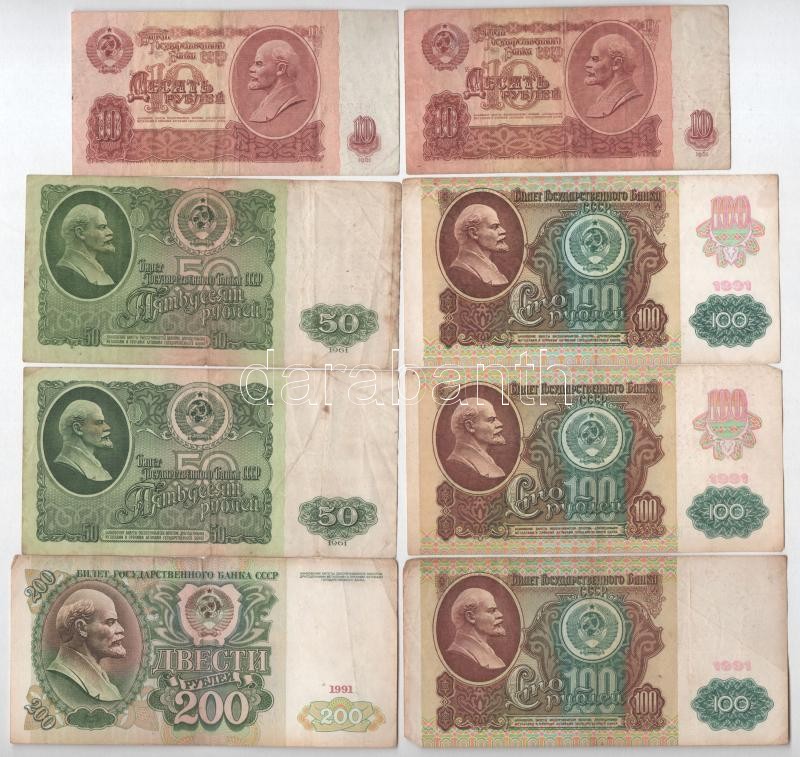 Leírás: Szovjetunió 1961. 10R (2x) + 50R (2x) + 1991. 100R (3x) + 200R T:III folt, kis szakadás