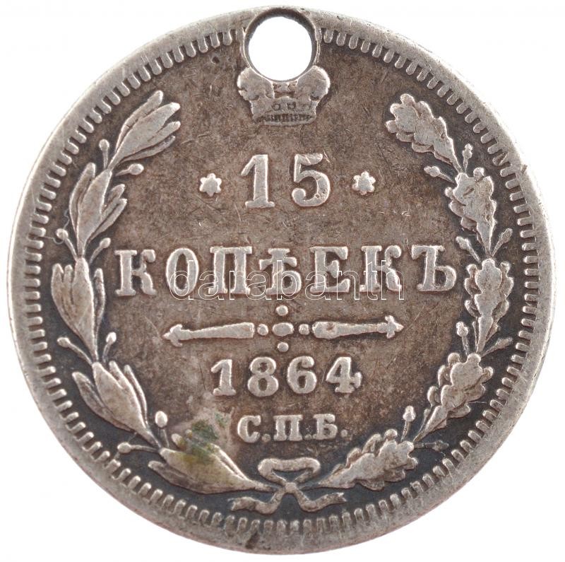 Russian Empire 1864. 15 Kopecks ... https://www.darabanth.com/hu/422-Gyorsarveres/422.0/Numizmatika/Kulfoldi-fem-es-ezustpenzek~2000011/Orosz-Birodalom-1864-15k-Ag-T3-ly-Russian-Empire-1864-15-Kopecks-Ag-CF-holed-Krause-Y2321~II2679096