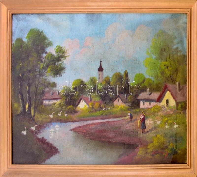 Leírás: Budaváry (?) jelzéssel: Falusi életkép. Olaj, vászon. Aranyozott, üvegezett fa keretben, 98x68 cm (külső méret: 110x80 cm)