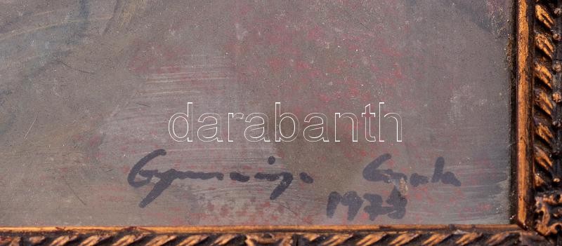 Leírás: Olvashatatlan (... Gyula?) jelzéssel: Női arc. Vegyes technika, karton. Üvegezett, sérült fakeretben. 26,5x18,5 cm