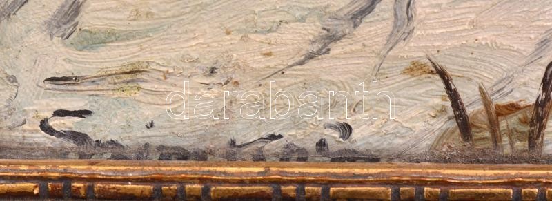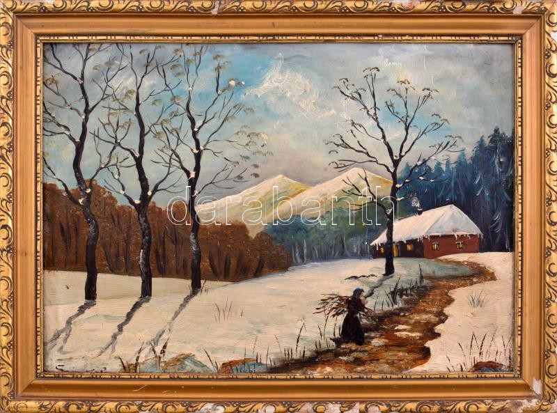 Leírás: Olvashatatlan jelzéssel: Rőzsehordó a hóban. Olaj, vászon. Dekoratív, sérült fakeretben. 33X46,5 cm