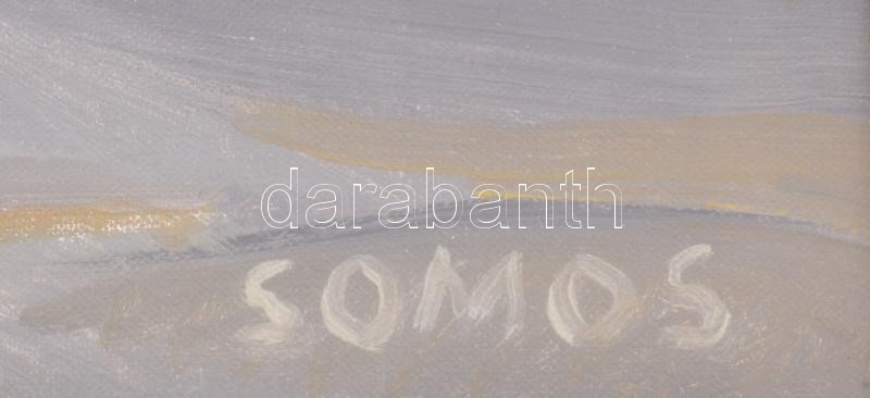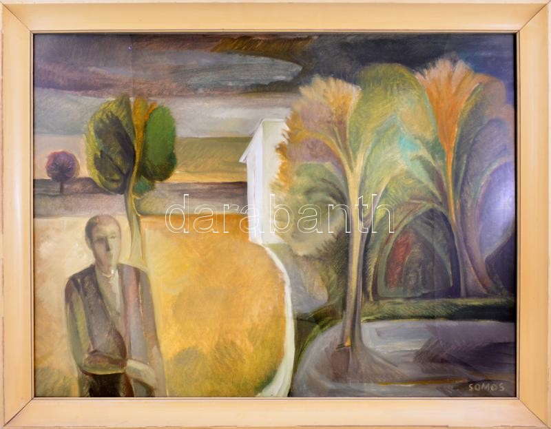 Somos Miklós (1933-2009): Alak tájban. Olaj, vászon, jelzett. Hátoldalán Képcsarnok Vállalat kissé töredékes címkéivel. Üvegezett, kissé sérült keretben. 60×80 cm
