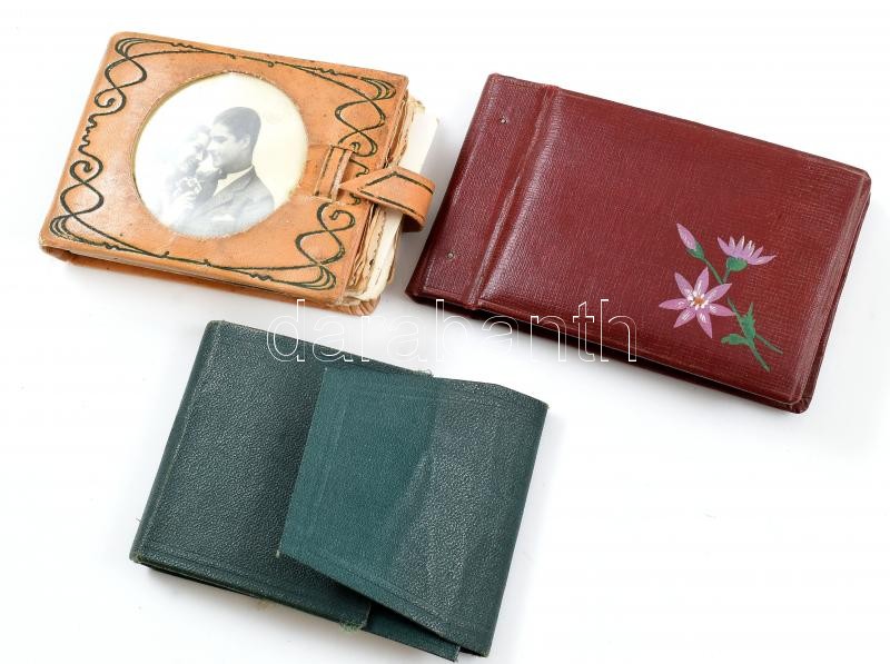 Leírás: 3 db régi / retró fényképtartó, benne vegyes fotókkal. Változó állapotban, 10x7 cm körüli méretben.