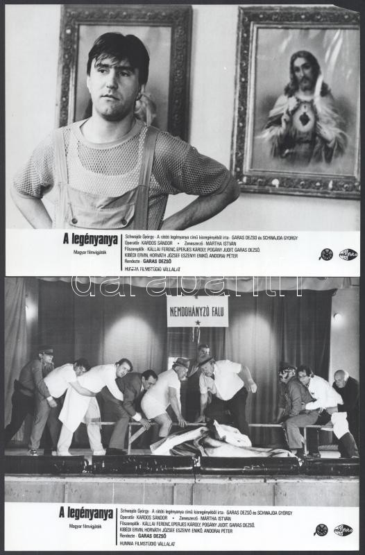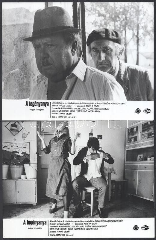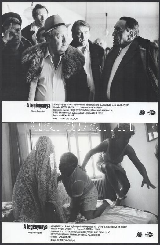 cca 1989 ,,A legényanya" című magyar filmvígjáték jelenetei és szereplői, 9 db vintage produkciós filmfotó, ezüst zselatinos fotópapíron, a használatból eredő (esetleges) kisebb hibákkal, 18x24 cm