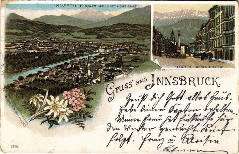 Leírás: 1897 (Vorläufer!) Innsbruck (Tirol), gegen Süden mit Hohe Saile, Maria Theresienstrasse. Art Nouveau, floral, litho (small tear)