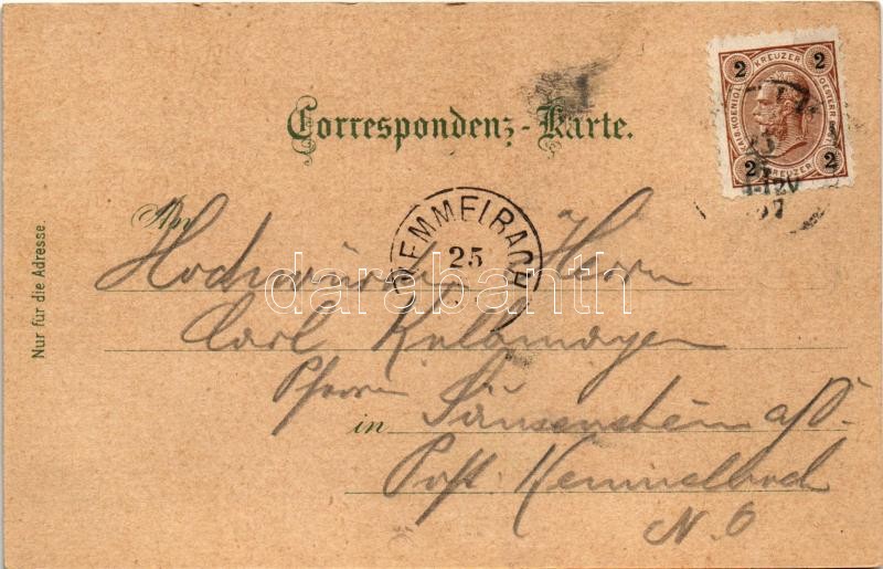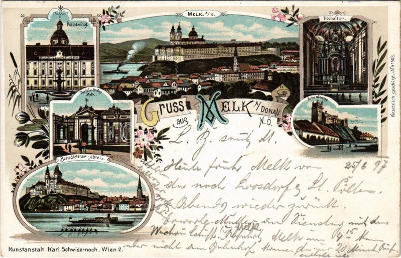 Leírás: 1897 (Vorläufer!) Melk, Prälatenhof, Hochaltar, Ruine Weitenegg, Benedictiner Abtei, Portal d. Stiftes Melk. Kunstanstalt Karl Schwidernoch Art Nouveau, floral, litho