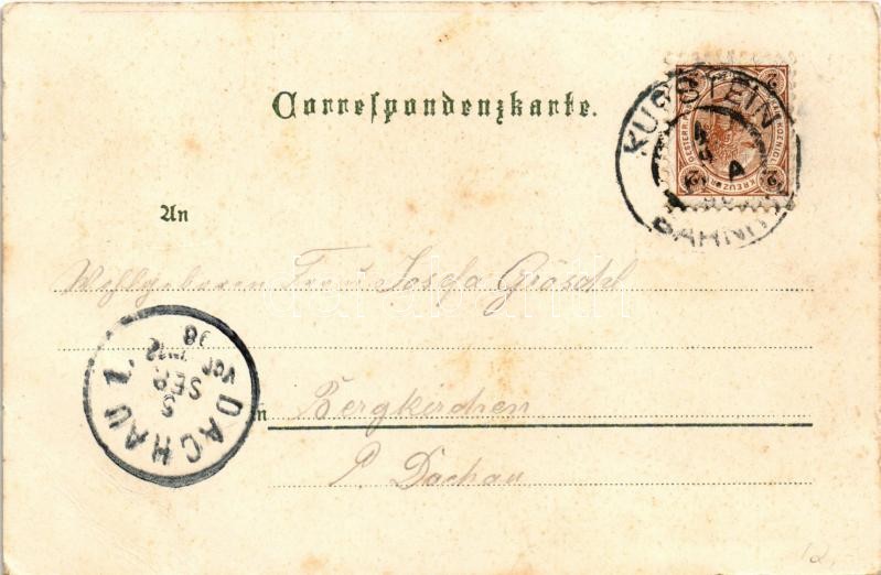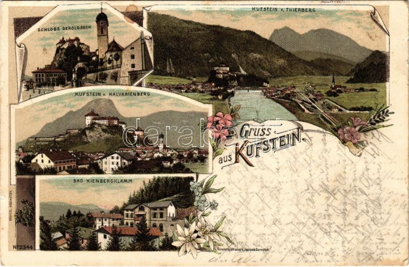1898 (Vorläufer) Kufstein (Tirol), Schloss Geroldseck, Kufstein v. Kalvarienberg, v. Thierberg, Bad Kienbergklamm. Kunstanstalt Lautz & Isenbeck No. 2344. Art Nouveau, floral, litho (EB)