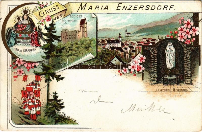 1898 (Vorläufer) Maria Enzersdorf, Heil der Kranken, Schloss Liechtenstein, Lourdes-Brunnen / pilgrimage church, castle. Art Nouveau, floral, litho (EK)