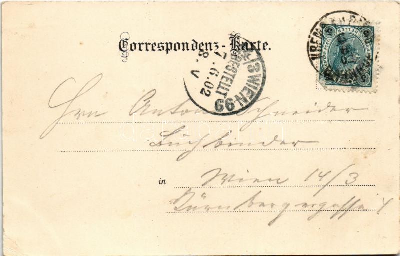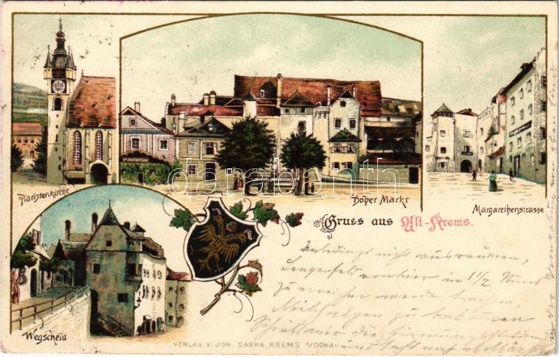1902 Krems an der Donau, Gruss aus Alt-Krems. Piaristenkirche, Hoher Markt, Margarethenstrasse, Wegscheid. Verlag v. Joh. Saska Art Nouveau, floral, litho (EK)