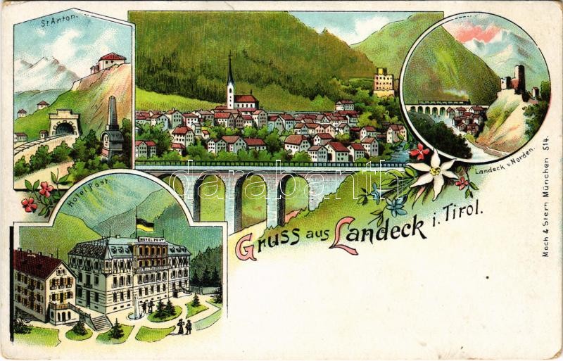 Leírás: Landeck im Tirol, St. Anton, Hotel Post, Viadukt / railway bridge, viaduct, locomotive train. Moch & Stern Art Nouveau, floral, litho