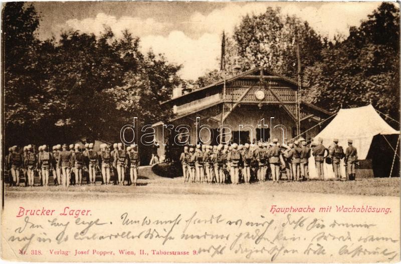 1901 Lajtabruck, Bruck an der Leitha; Főőrség őrségváltáskor. Josef Popper Nr. 318. / K.u.k. Hauptwache mit Wacheablösung / changing of the guards at the main guard station (Rb)