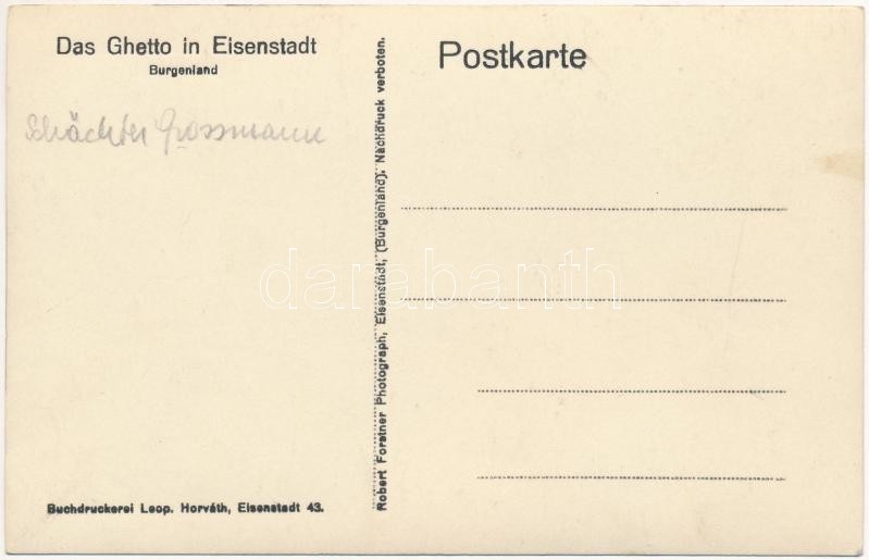 Kismarton, Eisenstadt; Das Ghetto. Robert Forstner Photograph, Buchdruckerei Leop. Horváth / A régi zsidó getto, héber felirat a házfalán / Old Jewish ghetto, Hebrew plate on the wall