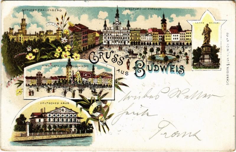 1900 Ceské Budejovice, Budweis; Schloss Frauenberg, Ringplatz mit Rathaus, Domkirche, Lanna Denkmal, Deutsches Haus / castle, main square, town hall, church, German House, monument. Schneider & Lux. Art Nouveau, floral, litho (EK)