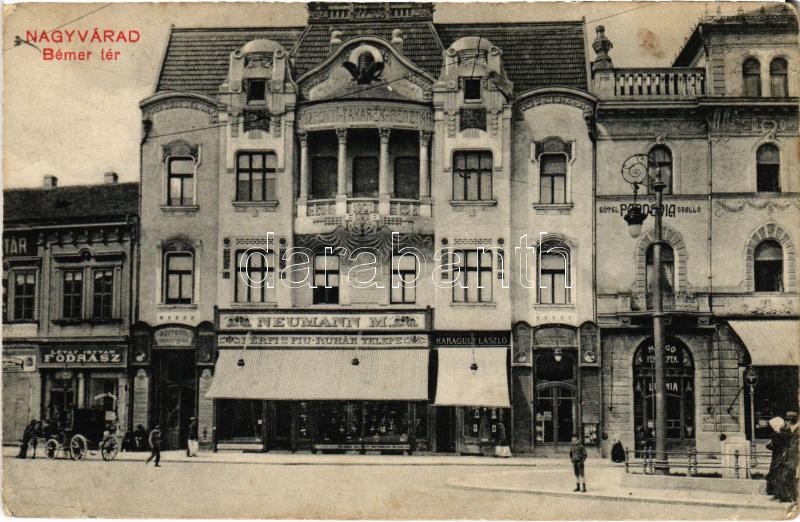 1912 Nagyvárad, Oradea; Központi Takarékpénztár, Pannónia Szálló, Bémer tér, Lévay István fodrász szalonja, Neumann M. ruhaüzlete, Karaguly László üzlete, Uránia Mozgó. Neumann M. saját kiadása / Central Savings Bank, Hotel, hair saloon, clothing shop, shops, cinema (EK)