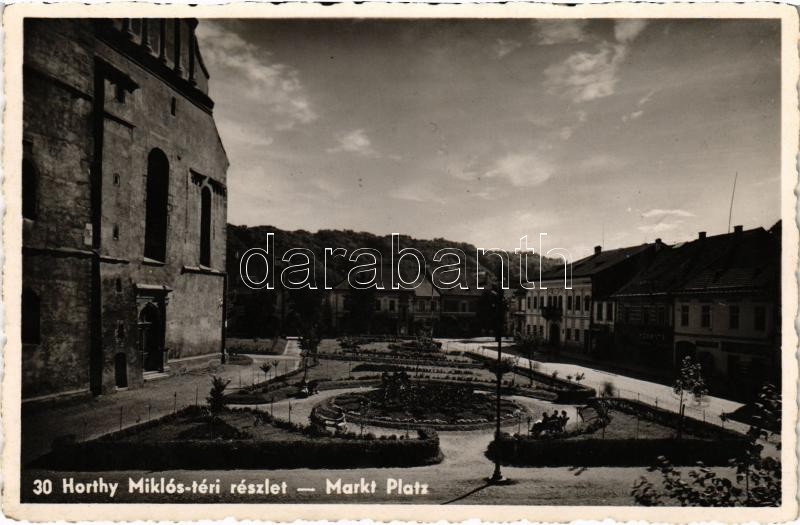 Leírás: 1943 Beszterce, Bistritz, Bistrita; Horthy Miklós tér, Schmidt, Kaufmann, Vass Lajos üzlete / square, shops