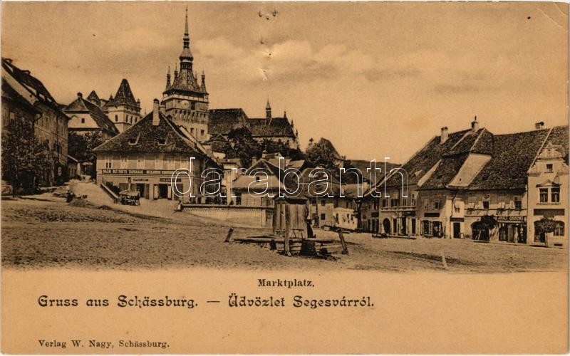 Segesvár, Schässburg, Sighisoara; Piactér, Hazai Biztosító Társaság, H. és Josef Girscht üzlete. W. Nagy kiadása / Marktplatz / market square, shops, insurance bank (apró lyukak / tiny pin holes)