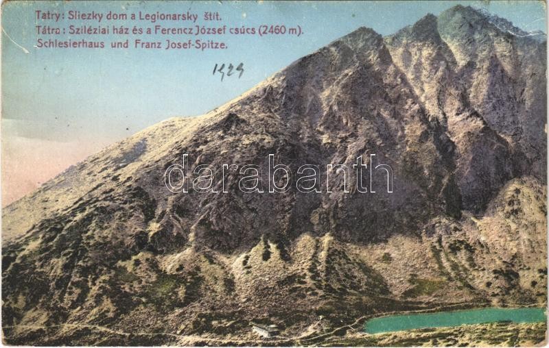 1929 Tátra, Magas-Tátra, Vysoké Tatry; Sliezky dom a Legionarsky stít / Sziléziai-ház és a Ferenc József-csúcs. Földes Samu kiadása 215. sz. / Schlesierhaus und Franz Josef-Spitze / tourist house, mountain peak (gyűrődés / crease)