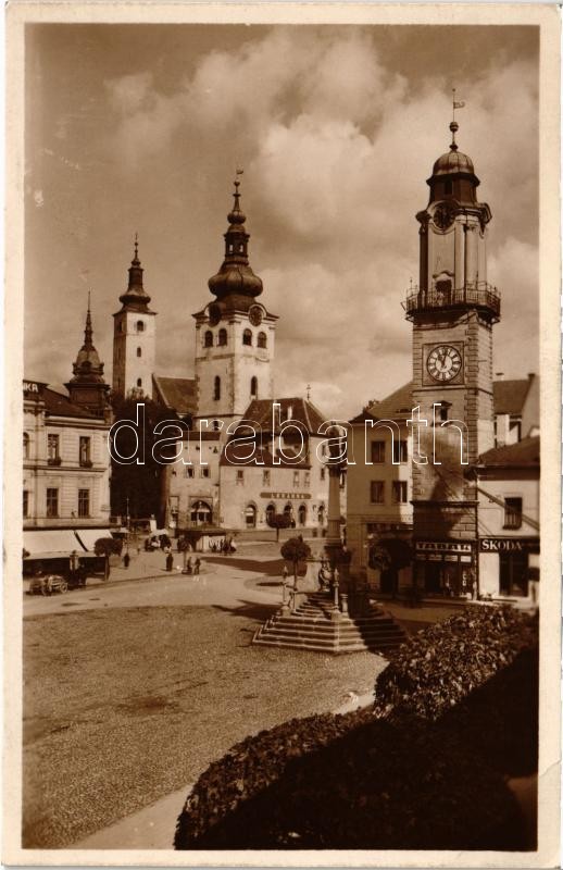 Besztercebánya, Banská Bystrica; Fő tér, gyógyszertár, templomok, Takarékpénztár, bank, Skoda és dohány üzlet / main square, pharmacy, shops, bank. Grafo Cuda Holice