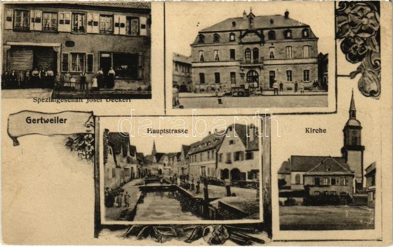 Leírás: 1918 Gertwiller, Gertweiler; Hauptstrasse, Kirche, Spezialgeschäft Josef Deckert / main street, church, town hall, shop. Floral (EK)