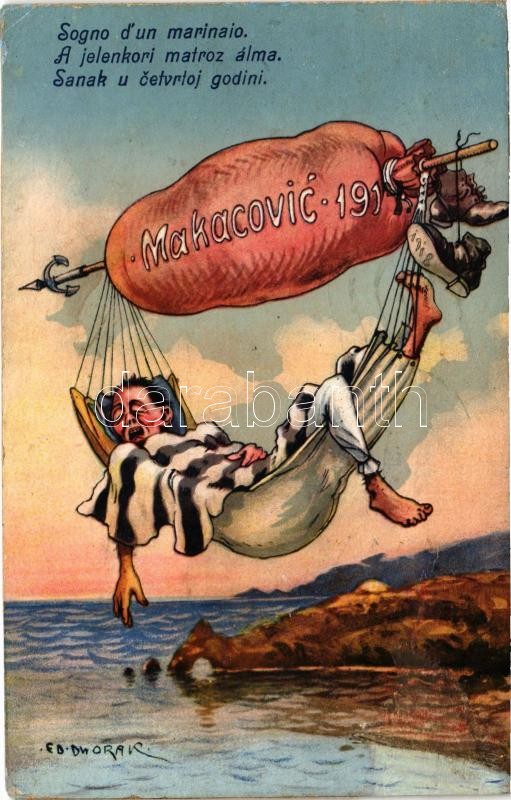 Leírás: Makacovic 1914. A jelenkori matróz álma / Sogno d'un marinaio / Sanak u cetvrtoj godini / K.u.K. Kriegsmarine Matrose / Austro-Hungarian Navy mariner humour art postcard. C. Fano 1914/15. 28. s: Ed. Dworak (felszíni sérülés / surface damage)