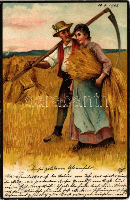 1902 Lady art postcard, romantic couple, folklore. litho (EK) https://www.darabanth.com/hu/423-Gyorsarveres/423.0/Kepeslapok/Holgyek~1500068/1902-Lady-art-postcard-romantic-couple-folklore-litho-EK~II2686683