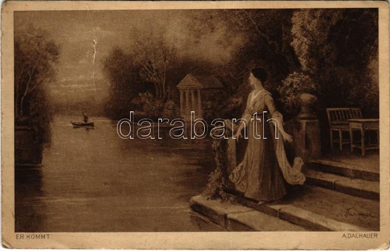 Leírás: Er kommt / Lady art postcard. Moderne Galerie Nr. 103. s: A. Dachauer (b)