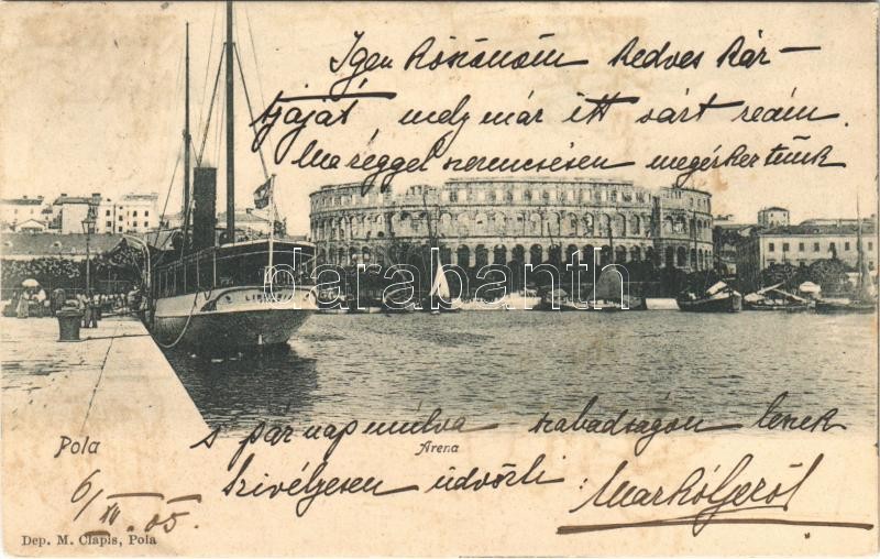 1905 Pola, Pula; Arena / amphitheatre, port, "Liburnia" stea... https://www.darabanth.com/hu/423-Gyorsarveres/423.0/Kepeslapok/Horvatorszag~1500008/1905-Pola-Pula-Arena-amphitheatre-port-Liburnia-steamship-Dep-M-Clapis-fl~II2367631